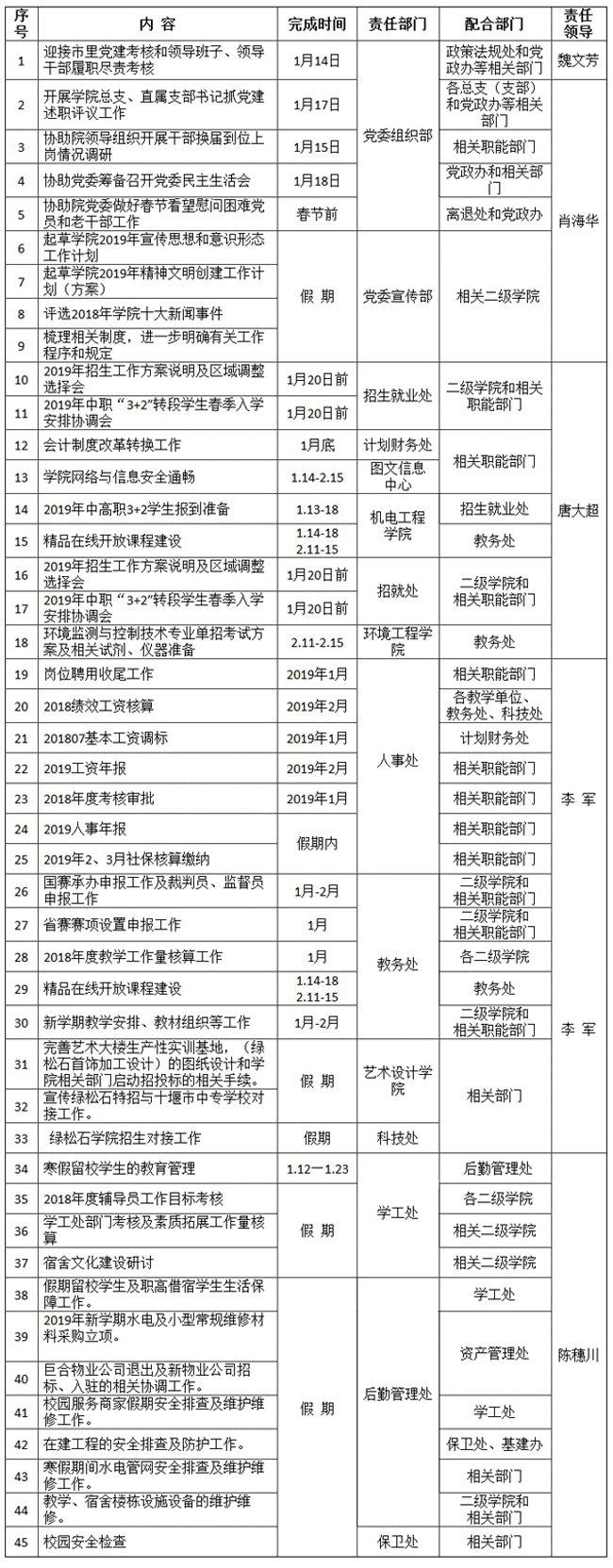 2019年寒假重点工作任务表