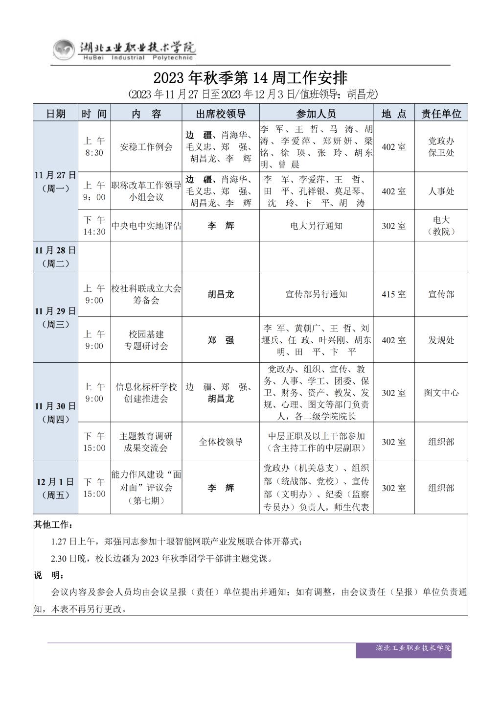 2023年秋季第14周工作安排