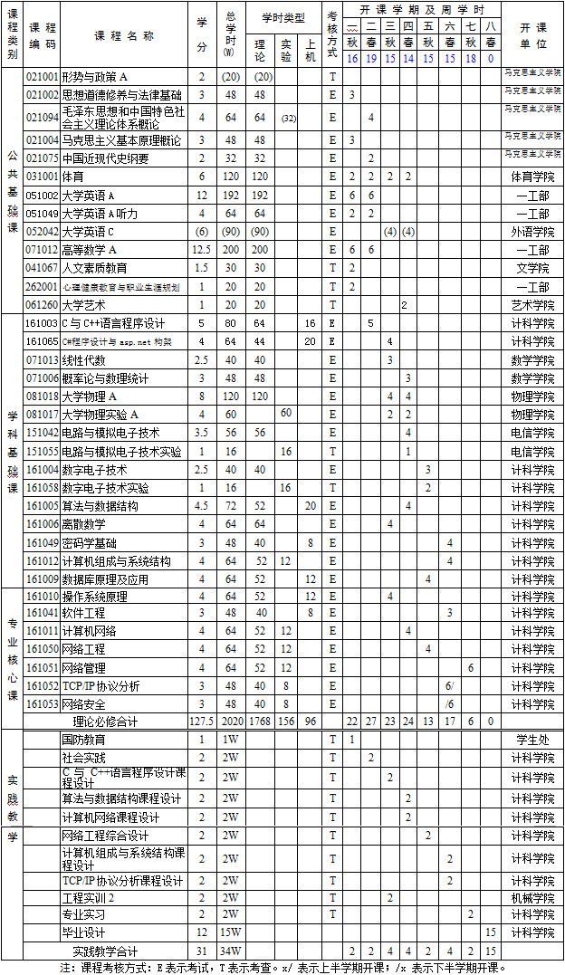 2.学位课程:马克思主义基本原理、大学英语、高等数学、C与C++语言程序设计、算法与数据结构、电路与模拟电子技术、数字电子技术、数据库原理及应用、操作系统原理、计算机组成与系统结构、TCP/IP协议分析、计算机网络、网络工程、网络管理、网络安全、软件工程。