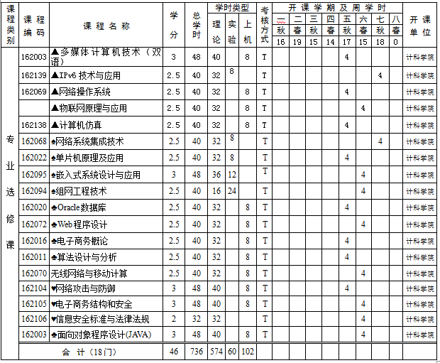 选修课(包括专业选修课和公共选修课)须修满29学分。学生应在下列专业选修课程中修满19学分,其中 ▲表示限制性选修课程;♠表示网络应用(偏硬件方向)选修课;♣表示网络应用(偏WEB应用方向)选修课;♥表示网络安全方向选修课;♦表示图形图像与多媒体技术方向选修课。公共选修课的设置由学校提供。