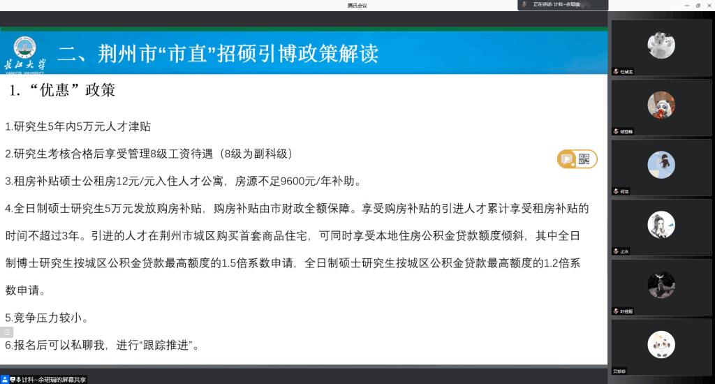 (通讯员 余珺瑞)我院于2月25日晚上7点在腾讯会议上召开19级研究生荆州市“招硕引博”政策解读及春招动员活动。本次会议由就业辅导员余珺瑞老师主持,学院副院长宋文广、党委副书记颜学俊、及全体19级研究生参加了本次活动。