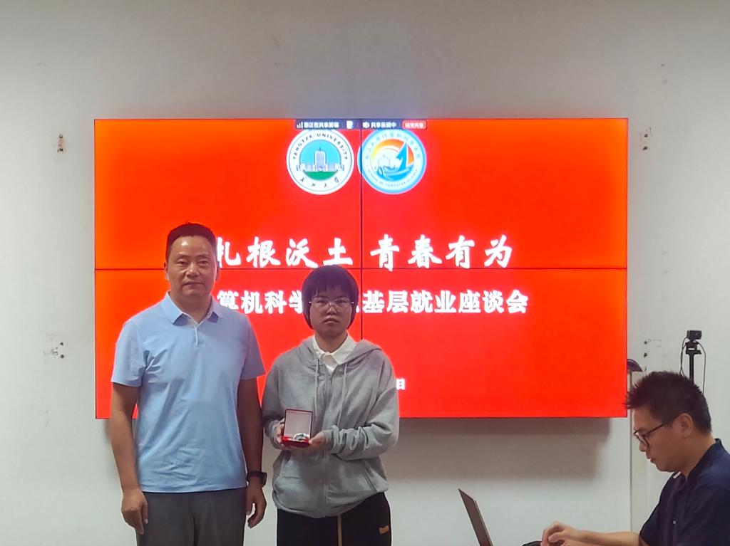 座谈会伊始,计算机科学学院副院长詹炜为活动致辞,他饱含深情地阐述了基层就业的重要意义与发展方向,为在场学子点明奋斗方向。随后,进入“金骆驼”代表颁奖环节,学院党委书记郑健为荣获该称号的基层就业先锋颁奖,表彰他们用行动诠释担当、用奉献书写青春的精神。