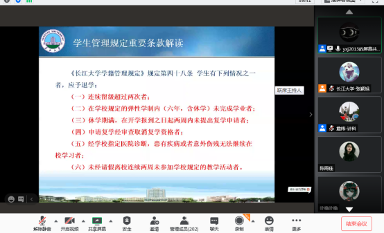 会议议程第二项,学院党委副书记颜学俊对学校及学院相关管理制度进行介绍,颜书记着重选取《长江大学学籍管理》中部分内容做了详细解读。随后,颜书记又对学生来校途中及报到后在校期间的管理做出各项安全提示。会议议程第三项,学院2020级辅导员张颖旭针对学生返校前的准备工作及新生报到流程作出详细说明,并且对家长关心的宿舍问题,军训安排等做出详细解答。