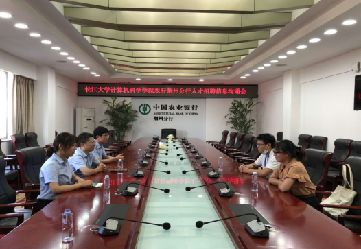 2020年9月2日15:00,农业银行荆州分行与计算机科学学院人才招聘信息沟通会在农业银行荆州分行办公室成功举行。此次招聘主要面向计算机及相关专业的2021届应届毕业本科生、研究生。参与此次会议的有农业银行荆州分行信息技术管理部总经理胡刚、高级专员刘自成、产品经理张之涵,长江大学计算机科学学院就业专干余珺瑞、应届毕业研究生丁程程。