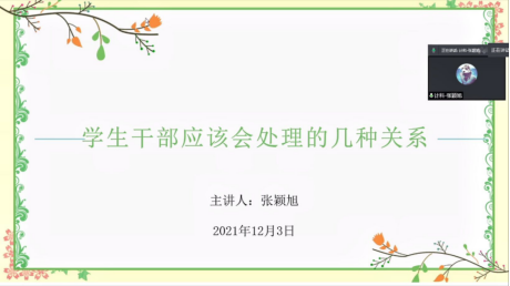 会议伊始,张颖旭老师首先对学生干部的定义进行分析,他指出,作为一名学生干部,要起到桥梁纽带的作用,处理好各种人际关系。随后,他结合自身的学干经验提出建议:“作为学生干部要注意自己的言行,要拉近与同学之间的距离。”最后,他用“风起于青萍之末,浪起于微澜之间”作为赠语结束了自己的分享,同时也希望同学们能有所收获,在以后的学干工作中不断提升自己帮助同学。