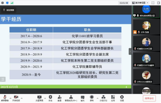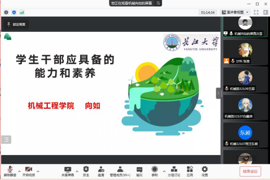 (通讯员:陈文博)2021年12月3日晚上18:30,计算机科学学院初级学生干部培训在腾讯会议上顺利召开。本次会议由计算机科学学院辅导员张颖旭、张茜,机械工程学院辅导员向如及化学工程学院兼职辅导员郭先哲主讲,各学院21级主要学生干部共同参加。