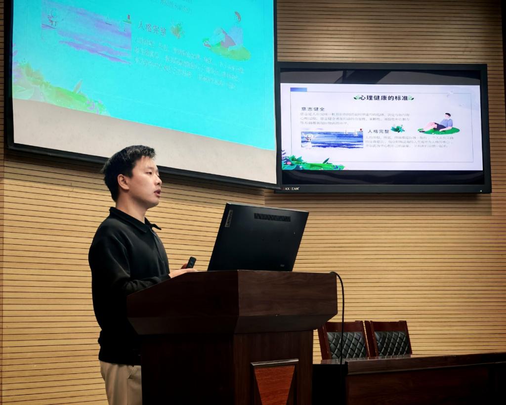 心理骨干培训环节由辅导员蒋代运主讲。他系统阐释了心理健康的多元标准,明确其涵盖智力、情绪、意志等维度的连续状态,清晰划分健康、不健康及异常心理边界,帮助骨干建立科学认知框架。针对“心理咨询仅面向特殊群体”的认知误区,培训着重强调其发展性功能,覆盖全体同学成长需求。在心理危机应对模块,蒋代运解析危机的双重性与个体性特征,传授“主动求助、倾听陪伴、及时报备”的核心应对方法,切实提升骨干的识别与初步干预能力。