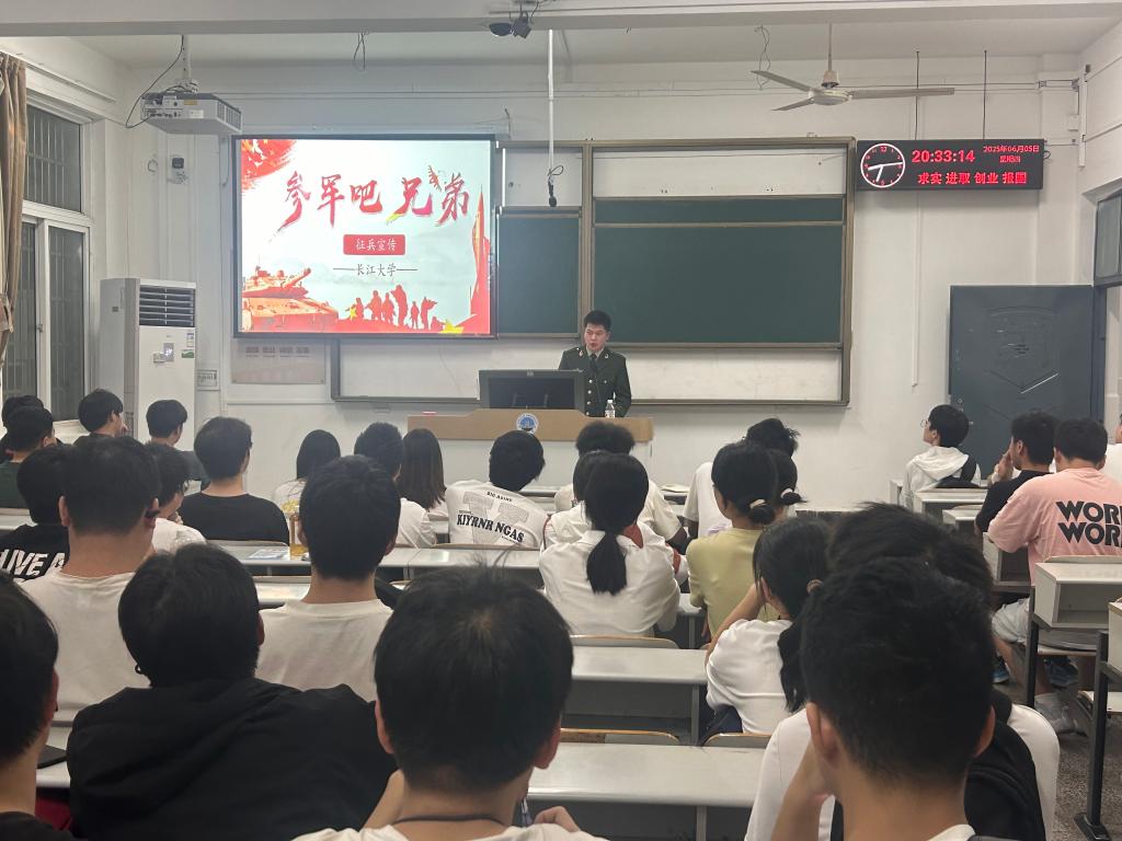 2025年6月5日晚7点,长江大学计算机科学学院在东校区13教B-402举行“青春铸盾·代码报国”征兵宣讲。征兵专干郭帅老师、退伍大学生代表及2021级60余名同学到场,辅导员郭帅主持活动。