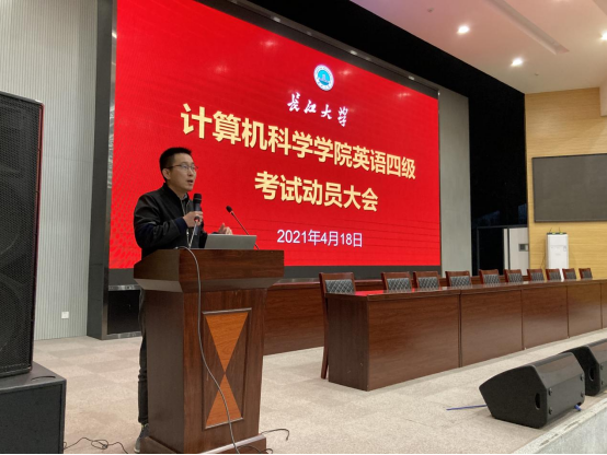(通讯员:张颖旭、谭京红)为营造良好学习氛围,激发学生英语学习热情,提高学生英语学习技巧,2021年4月18日晚19:40,计算机科学学院在农科大楼1058报告厅召开了英语四级动员大会。学院副院长詹炜、党委副书记颜学俊、外国语学院教师卢斌、20级专职辅导员张颖旭、兼职辅导员谭京红以及全体20级学生参加了此次大会,大会由学院党委副书记颜学俊主持。