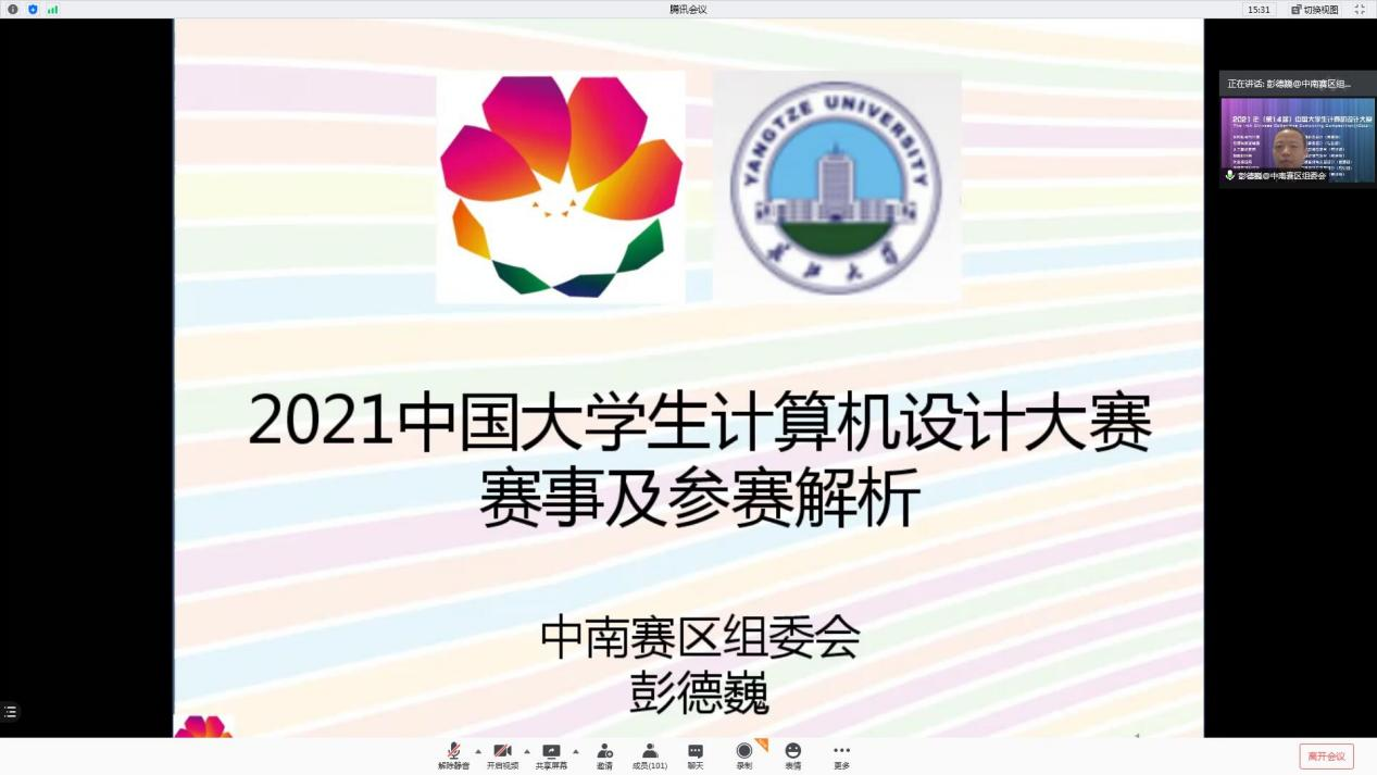 (通讯员 张茜)2021年5月14日上午,受长江大学计算机科学学院邀请,武汉理工大学彭德巍教授在腾讯会议上,为我校师生作做2021年计算机设计大赛赛事解析和参赛指导,学校参赛老师和同学参加了此次讲座。
