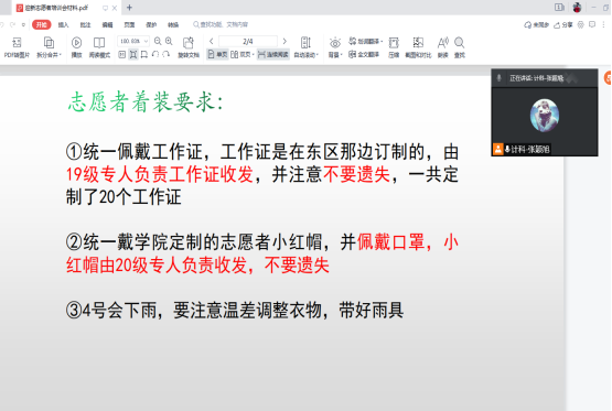 据悉,为确保迎新工作的顺利进行,学院在前期做了大量的准备工作。院学生会主席团负责招募迎新志愿者,学院为志愿者统一配备了工作证和志愿者帽,新生辅导员张颖旭对志愿者进行了线上线下培训,培训会上,张老师就志愿者排班、着装、职责及安全事项等方面作出明确要求。