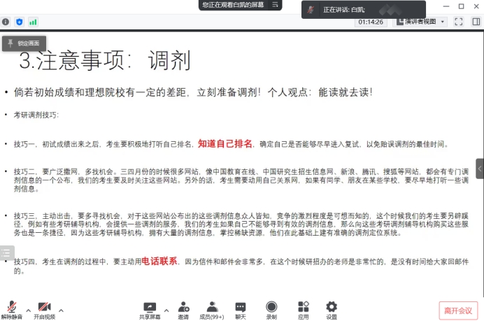 接下来,物联网工程系副主任白凯老师强调了初试和复试同等的重要性。和大家分享了考研复试经验和调剂注意事项,并对复试需要准备的资料及常见问题进行了较全面的讲解。