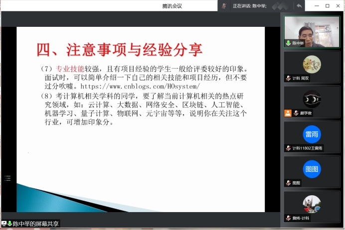 会议开始,计科系主任雷鸣老师、副主任黄岚老师,从“知彼”“知己”“战”“胜”四个方面出发,和大家交流了研究生复试前后必须注意的相关细节。