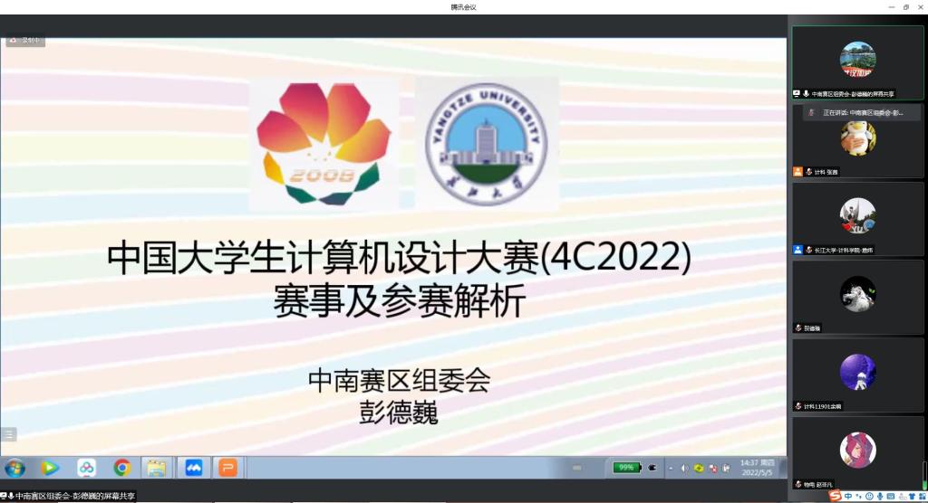 (通讯员 张茜)20225月5下午2点30,武汉理工大学彭德巍教授在腾讯会议上为我校师生作2022年计算机设计大赛赛事解析和参赛指导。本次会议由计算机科学学院副院长詹炜老师主持,参赛项目的指导老师和同学参加了此次会议