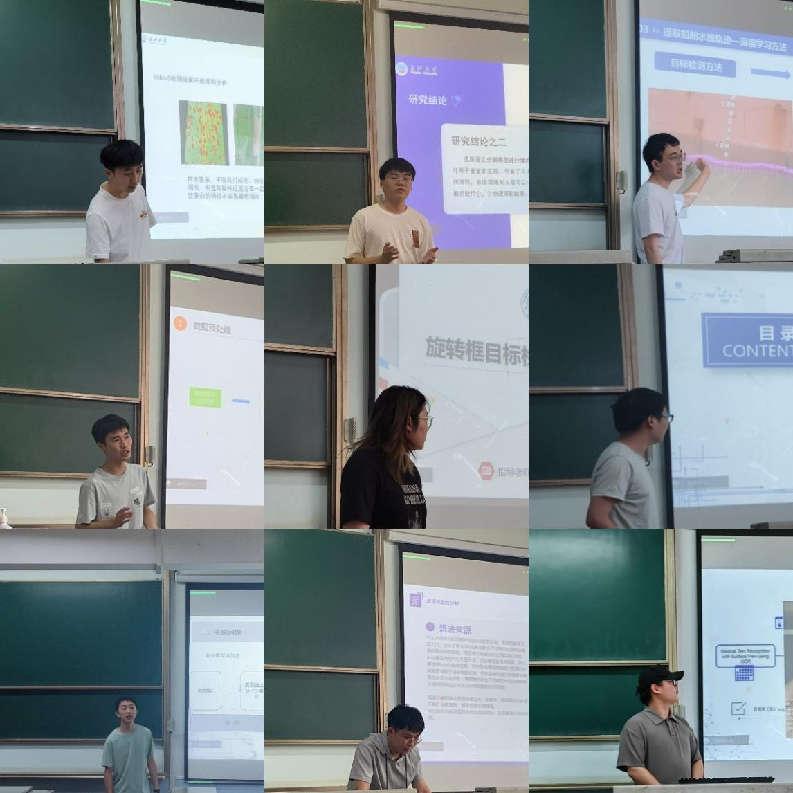 报告会上,九位研究生根据自己的研究方向,结合理论研究和实验分析,深入浅出的解说其研究领域的学术动态,并用合理、可靠的数据对研究的进展和研究成果进行了展示。本次报告会上分享了九个课题:深度学习在玉米病虫害识别中的应用分析,旋转框目标检测在遥感图像中的应用,基于模型融合的纤维混凝土强度预测,船舶水尺读数研究与应用,改进的R(2+1)D网络模型在昆虫行为识别领域的应用,语义分割在猪肉大理石纹预测中的应用,基于序列分解算法和LSTM的农产品价格预测,基于深度学习的光学字符识别的研究,基于yolov5改进的矿物检测算法。