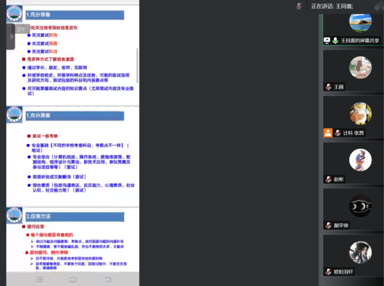 接着,软件工程系主任王同喜老师从充分准备、应答方法、常见提问、注意事项四个方面进行拓展,其讲解的内容包括复试的各个阶段,并强调大家需要调节好自己的心态来应对复试。