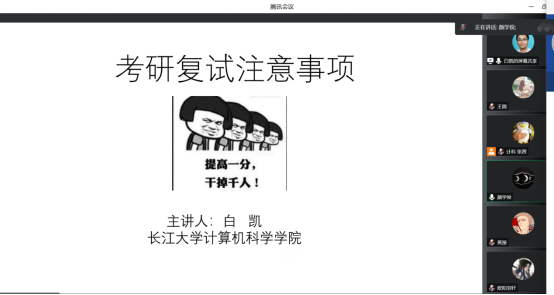 会议开始,物联网工程系主任白凯老师着重分析了疫情对2023年考研形势产生的影响,同时和大家分享了考研复试经验和调剂注意事项,并对复试需要准备的资料及常见问题进行了比较全面的讲解。