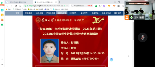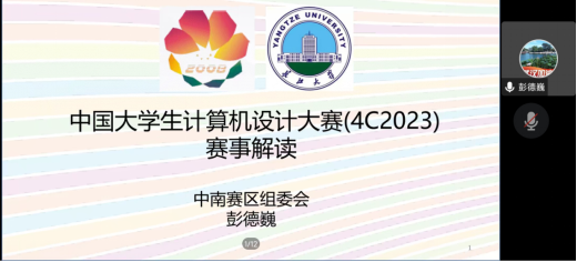 (通讯员 张茜 王圆)2023年3月30日下午2点30,武汉理工大学彭德巍教授在腾讯会议上为我校师生做了2023年计算机设计大赛赛事解析和参赛指导。本次会议由计算机科学学院副院长詹伟老师主持,参赛项目的指导老师和学生参加了此次会议。