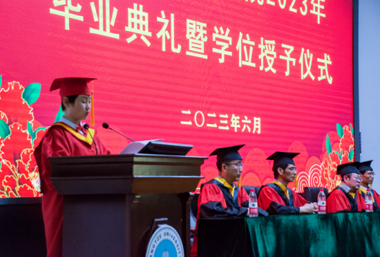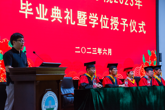 下午两点,毕业典礼在暖心视频的共同记忆中拉开帷幕,主持人宣布典礼正式开始,全体成员激昂奏唱庄严国歌。首先学院党委副书记颜学俊宣读2023届优秀毕业生名单,今年本院共有70名本科生和8名研究生被评为长江大学“优秀毕业生”。颜书记鼓励优秀毕业生谦虚谨慎、再创佳绩,号召全体毕业生以优秀毕业生为榜样,勤奋学习、积极进取,努力成为新时代中国特色社会主义的建设者和接班人。