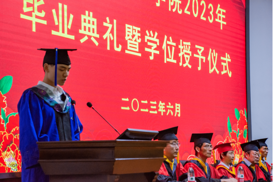 随后,学院本科、硕士毕业生代表依次上台发言。本科毕业生代表张君豪回顾了大学四年求学时光中的收获、感动与成长,并表达对各位恩师的敬爱与祝福。硕士毕业生代表孙立超将懂感恩、守初心与再奋斗的情感用“春蚕到死丝方尽,蜡炬成灰泪始干”、“天行健,君子以自强不息;地势坤,君子以厚德载物”、“不忘初心,砥砺前行”三句名言表达,并祝愿“母校桃李芬芳,学院再创辉煌”。