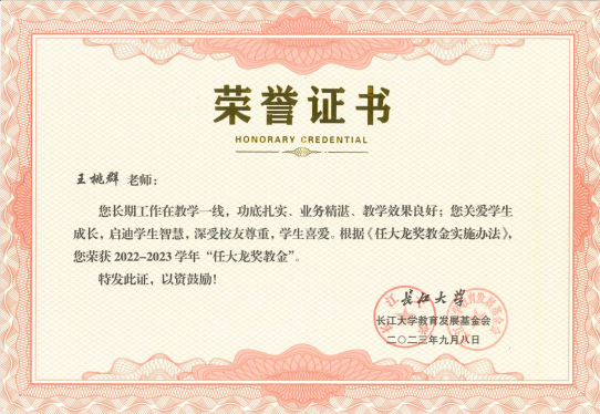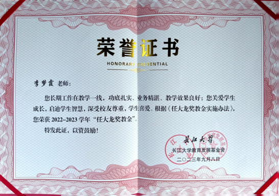 白凯、付盈两位老师荣获长江大学2023 年“一束光学工奖”