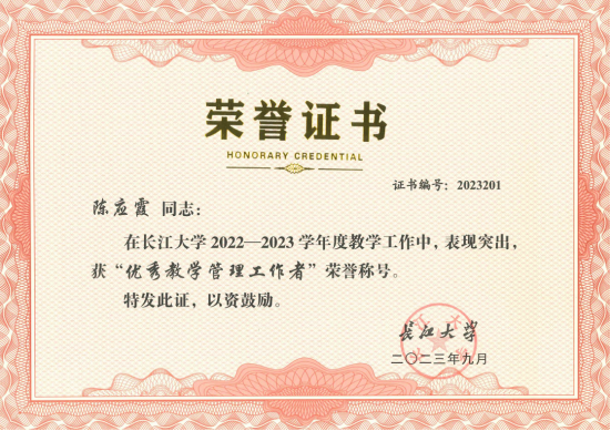 陈应霞老师荣获2022-2023年“优秀教学管理工作者”荣誉称号