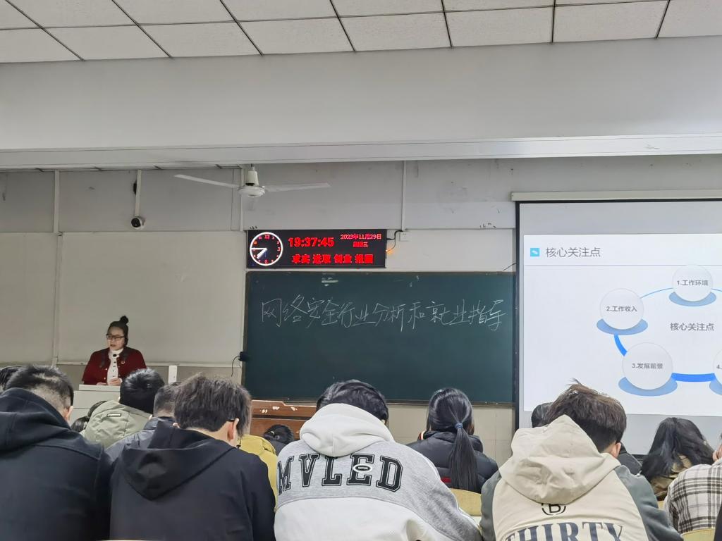 (通讯员 余珺瑞 高昕)计算机科学学院于2023年11月29日晚上7点,在12教104教室举办了一场以“网络安全发展形势与就业指导”为主题的讲座。本次讲座特邀奇安信集团校企合作部副总监总监闫军霞女士主讲,由网络工程系副主任胡蓉华负责主持。计算机科学学院副院长陈中举、信息安全专业潘劲松老师以及200余名同学参加。 首先,闫总分析了当前的就业形势。由于应届毕业生就业率降低和企业裁员加剧,毕业生面临着与考研失利学生以及社招人群的激烈竞争。因此,抢占先机至关重要。他建议同学们从大三下学期开始投递简历并进行笔试面试准备,并在大三暑假前进行简历投递。 接着,闫总分享了招聘流程、简历编写等方面的建议,强调了面试前全面准备的重要性,以帮助求职者在竞争中脱颖而出。他还普及了劳动法相关规定,建议求职者了解一些法律知识,为求职者提供全面的保障和指引。 最后,闫总讲解了网络安全的重要性。他指出,网络安全已成为国家战略,每个人都应该重视网络安全。在这个信息爆炸的时代,网络安全不仅是国家安全的重要一环,更是每个人的责任。 此次讲座为正在求职的同学提供了实用的就业指南,增强了他们的就业竞争力。同时,也普及和提高了国家网络安全意识和个人网络安全意识。 审核:陈中举 编辑:余珺瑞