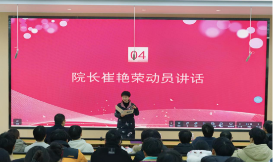 活动尾声,院长崔艳荣发表动员讲话,以计算机学科特色为切入点,为学子们送上殷切嘱托。她提出三点期望:一是保持“代码调试”般的耐心,面对备考难点不急躁、不气馁,逐一梳理问题、突破瓶颈,稳步推进复习进度;二是秉持“算法优化”般的智慧,科学规划剩余时间,根据自身情况合理分配答题节奏,提高复习效率与应试能力;三是坚守“系统运行”般的稳健,注重劳逸结合,及时调整身心状态,以饱满的精神面貌迎接考试的检验。