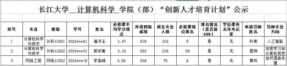 计算机科学学院2020级本科生“创新人才培育计划”选拔结果公示