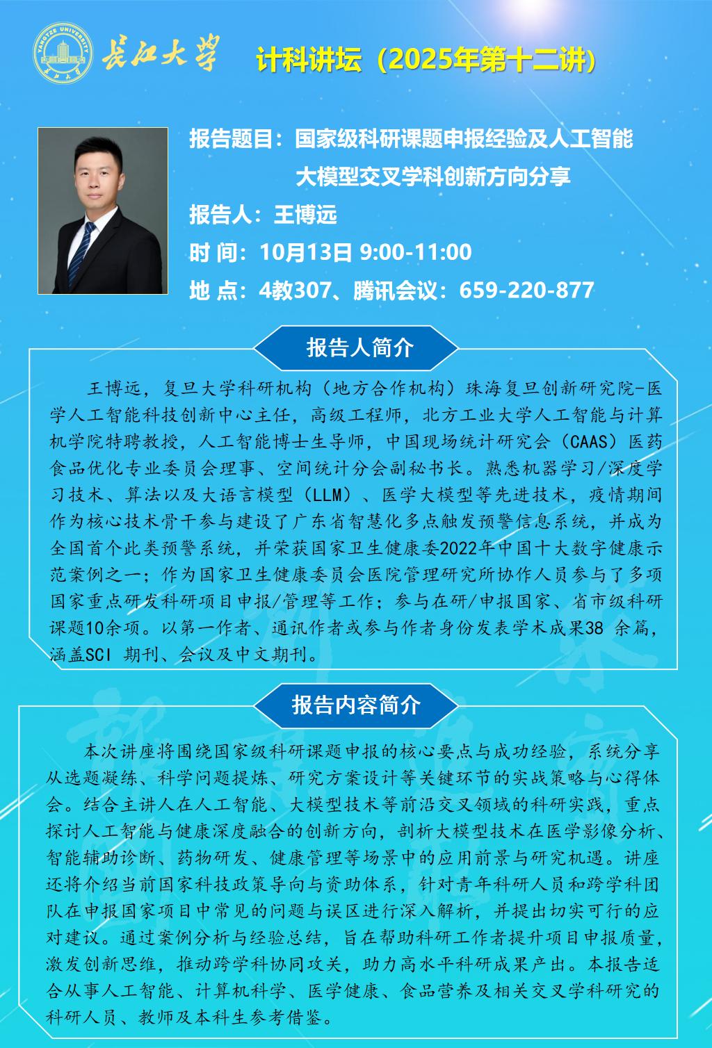 计科讲坛(2025年第十二讲):国家级科研课题申报经验及人工智能大模型交叉学科创新方向分享